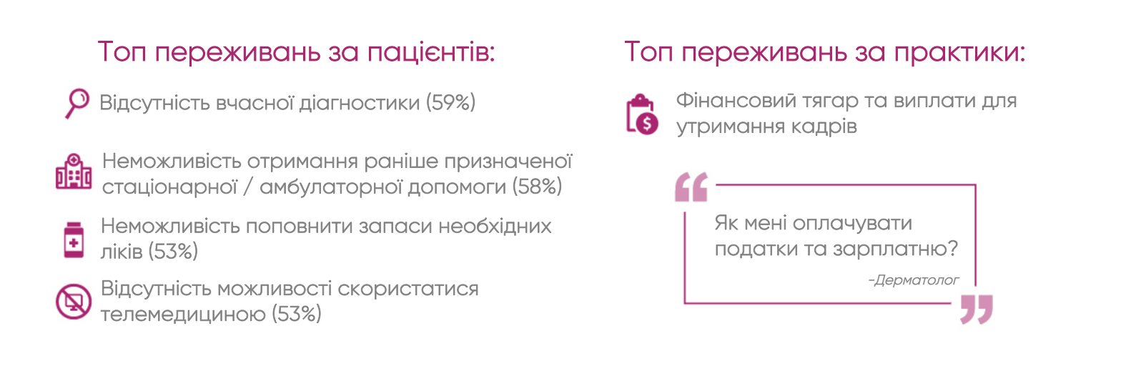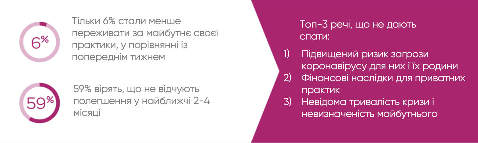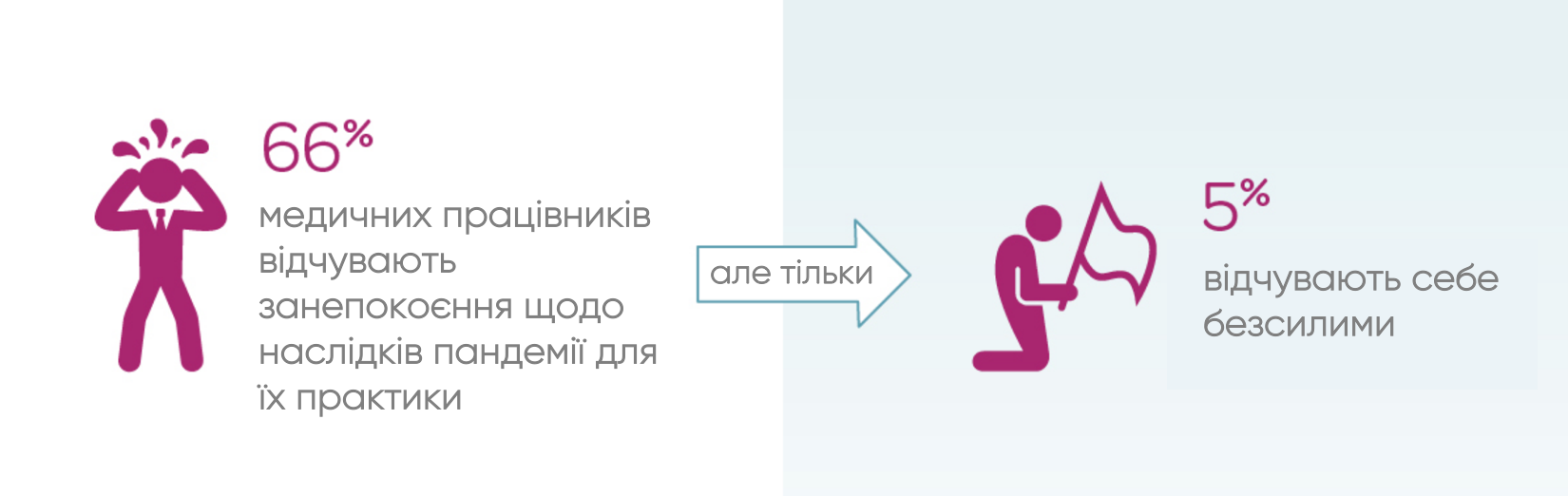 «Багато з медичних працівників, які взяли участь у цьому опитуванні, не тільки турбуються про короткострокові проблеми, а й шукають довгострокові рішення». В опитуванні були й позитивні новини. Хоча в цілому 66% медичних працівників повідомили, що відчувають занепокоєння з приводу COVID-19, оскільки це відбивається на їх практиці, тільки 5% заявили, що відчувають себе безсилими.